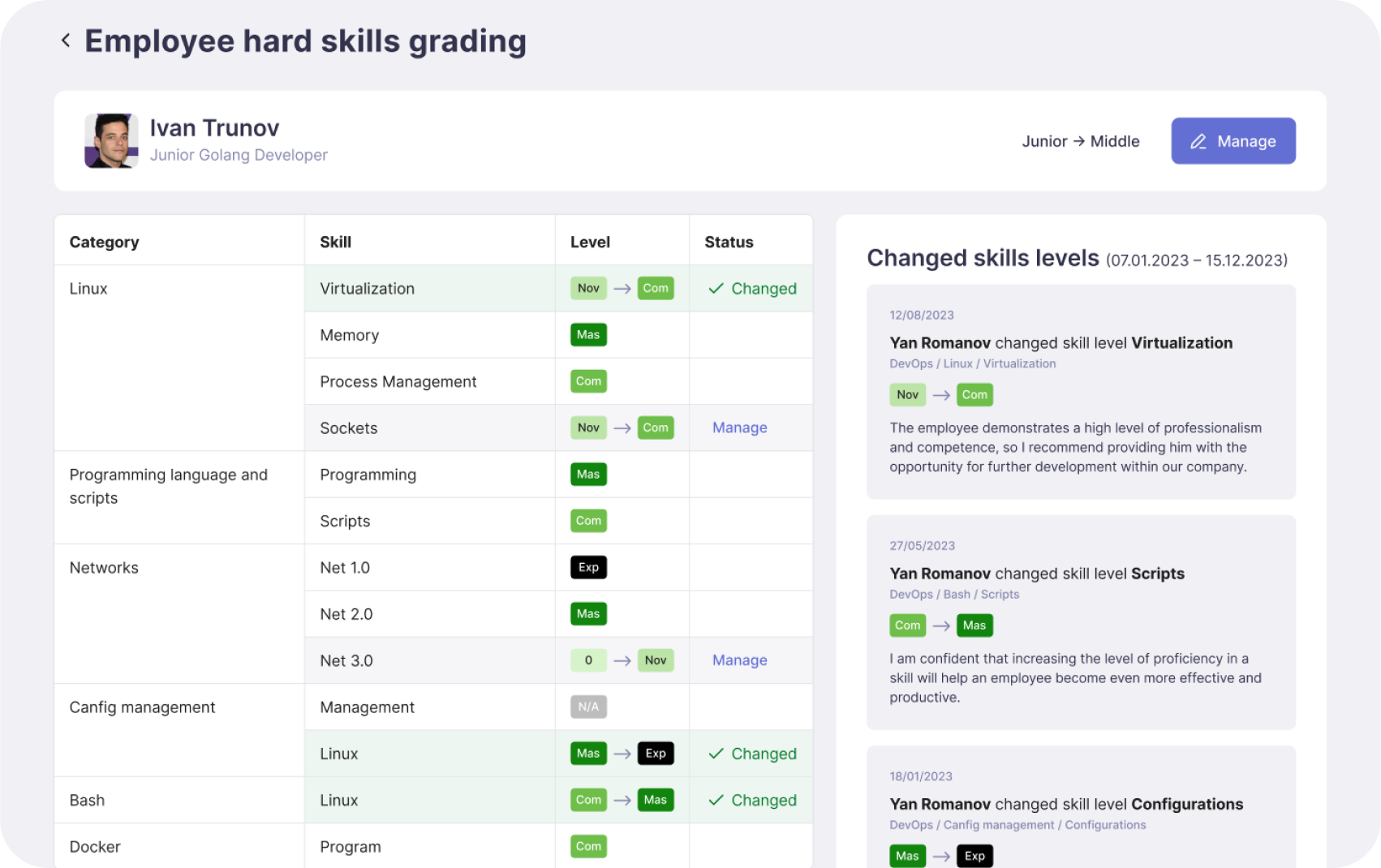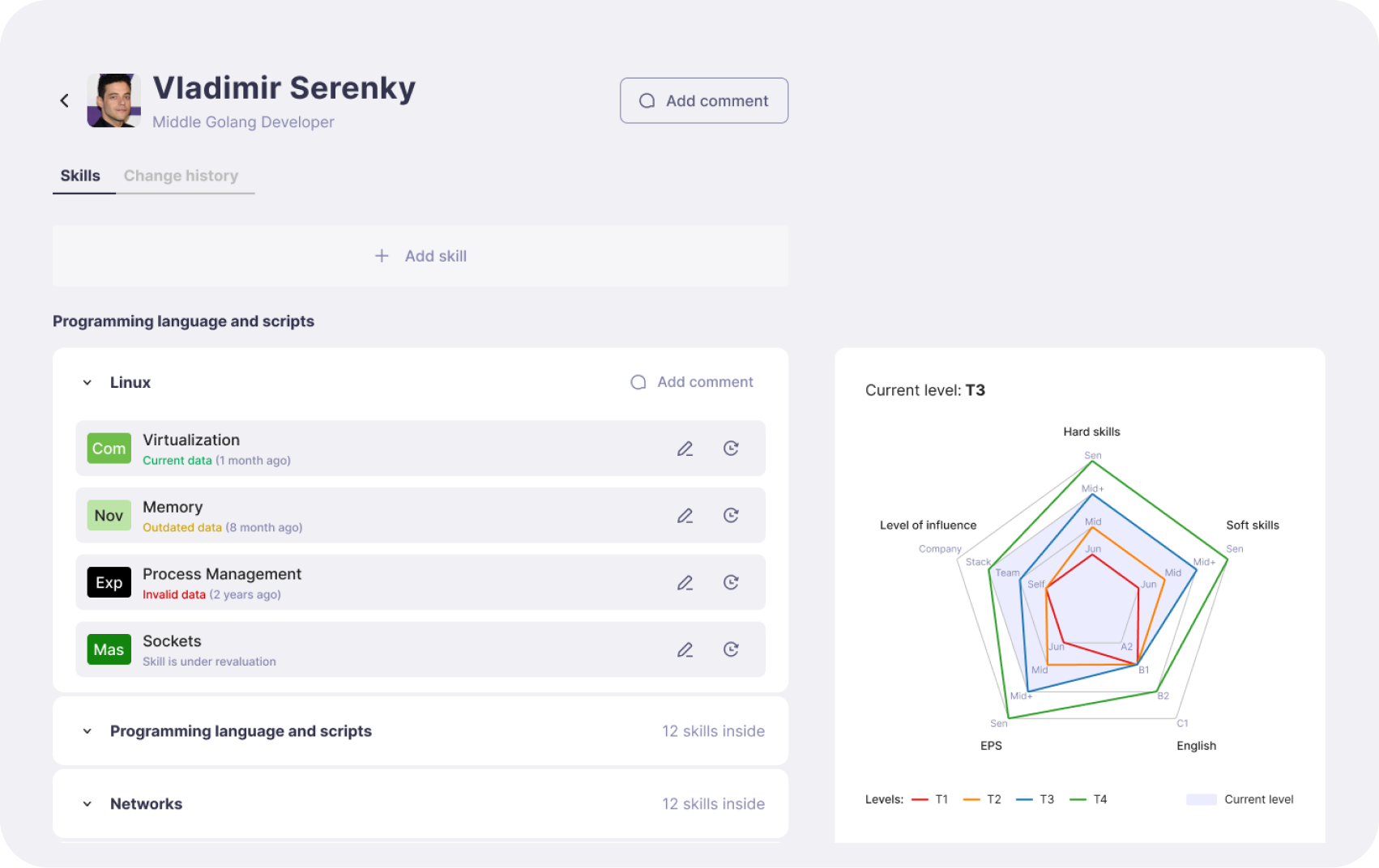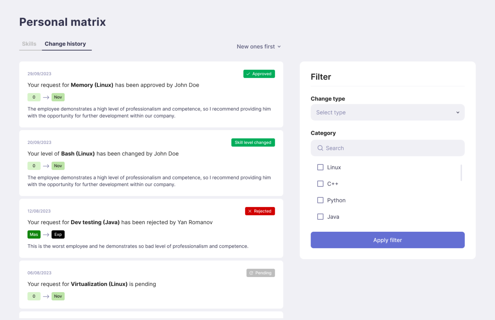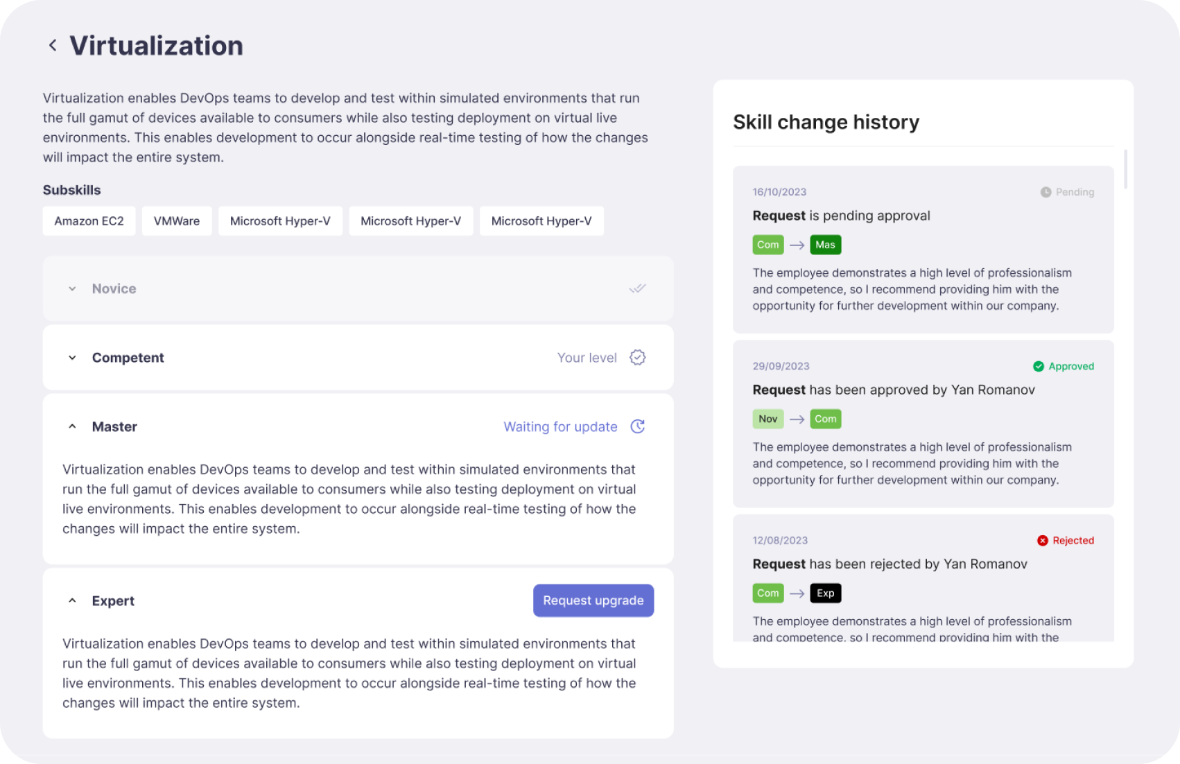 Системы оценки и развития в компаниях всегда уникальна для каждой компании. Skill Matrix – это не коробочное решение, поскольку предлагает быструю индивидуальную настройку непосредственно под ваши требования. Мы не хотим менять ваши внутренние процессы, а вместо этого – гармонично встроить в них наше решение.